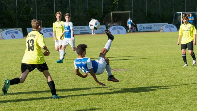 Kaiserwetter und eine tolle Fußballatmosphäre lassen das EM-Aus des Deutschen Teams bei der Europameisterschaft in Frankreich schnell vergessen. Zwischen Halbfinale und EM-Finale in Paris tummelten sich am 09. und 10.Juli mehr als 500 Fußballer der Bambini- bis zur C-Jugend Klasse an 2 Turniertagen auf dem Sportplatzgelände in Gerolstein. Vereine aus dem Eifelkreis Bitburg-Prüm, aus Trier und der Moselregion und dem Vulkaneifelkreis stellten die meisten Teilnehmer. Mit dabei waren auch Jugendmannschaften aus Erft (Euskirchen), Honsfeld (Belgien) und Advendo 57 (Niederlande). Ermöglicht wurde die Veranstaltung durch die Initiative „Team mit Stern“ des Gerolsteiner Brunnens. Die JSG Kyltal wurde mit Ihrer Bewerbung prämiert. Sportlicher Höhepunkt am Samstag war die Begegnung der U-15 Regionalligamannschaft von Eintracht Trier gegen eine Auswahl „Gerolsteiner Land“ mit niederländischer Beteiligung. Für die Verantwortlichen der JSG um den Vorsitzenden Reinhard Kröffges stand ein arbeitsreiches Wochenende auf dem Programm. Ein großes Helferteam mit Trainern, Betreuern, Eltern und Großeltern sorgte für einen reibungslosen Ablauf des Turniers. Die jungen Kicker freuten sich über jede Menge Fußballspaß und tolle Sachpreise für die teilnehmenden Mannschaften.